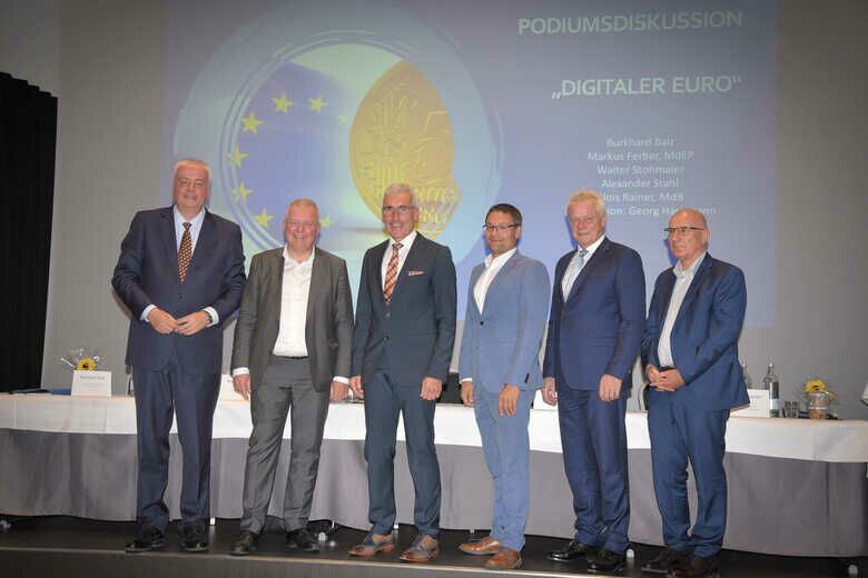 Deutliche Skepsis äußerte in der Diskussion der Europaabgeordnete Markus Ferber (CSU). Er sagte, die Idee des digitalen Euro als weiteres Zahlungssystem sei "eine Lösung für etwas, wo es kein Problem gibt", denn es gebe bereits digitales Geld, etwa auf dem Girokonto. Für ihn erschließe sich somit der Mehrwert noch nicht. Die bisher vorgelegten Konzepte seien für ihn noch nicht befriedigend, Probleme sehe er etwa beim Datenschutz und dem geschäftlichen Zahlungsverkehr. "Solange zentrale Fragen nicht beantwortet sind, brauchen wir das nicht."